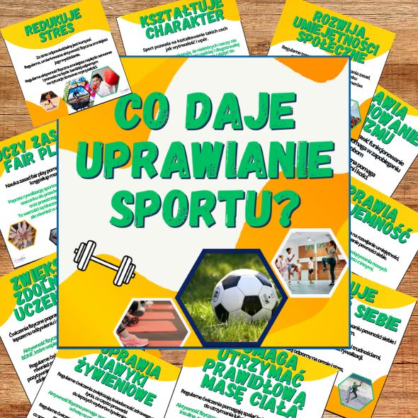 CO DAJE UPRAWIANIE SPORTU?  to zestaw 14 obrazków, które zawierają odpowiedzi na pytanie Co daje uprawianie sportu? oraz 1 obrazek tytułowy.  Obrazki będą wspaniała pomocą, którą można wykorzystać do powieszenia na tablicy, na drzwiach, a plik pdf może posłużyć jako prezentacja podczas zajęć z uczniami. Ta wersja przeznaczona jest dla starszych uczniów, gdyż odpowiedzi sformułowane są w sposób poważniejszy i dostosowany do uczniów starszych. Wersja pdf może również posłużyć jako prezentacja na zajęcia z uczniami czy spotkanie z rodzicami.
