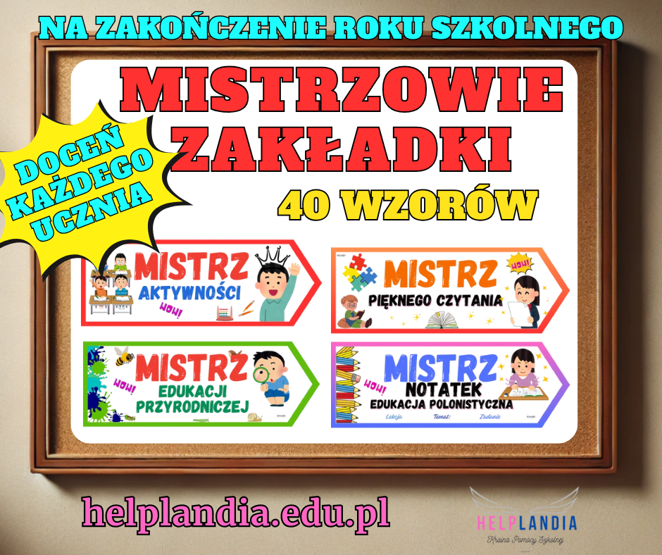 Zakładki dla uczniów „MISTRZ…np. pięknego czytania, aktywności, zajęć sportowych itp. to zestaw, aż 40 propozycji, które pozwolą na docenienie każdego ucznia Twojej klasy. Na jednej stronie A4 znajdują się 2 zakładki więc łącznie jest to 20 stron A4.